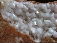 | Stellerit, Straßenanschnitt nahe Edinbane, Isle of Skye, Schottland. Dieser recht seltene Zeolith kann hier in einer drusenreichen Lavaschichtis recht häufig gefunden werden. Er wird begleitet von Calcit, Stilbit und Heulandit. Die räumliche Nähe zum Stilbit, der dem Stellerit sehr ähnlich ist, macht eine sichere Unterscheidung der beiden Minerale schwer. Die gezeigte Stufe wurde nicht getestet, aber die Kristallform und der in der anderen Drusenhälfte sitzende Calcit deuten verstärkt auf Stellerit. | |